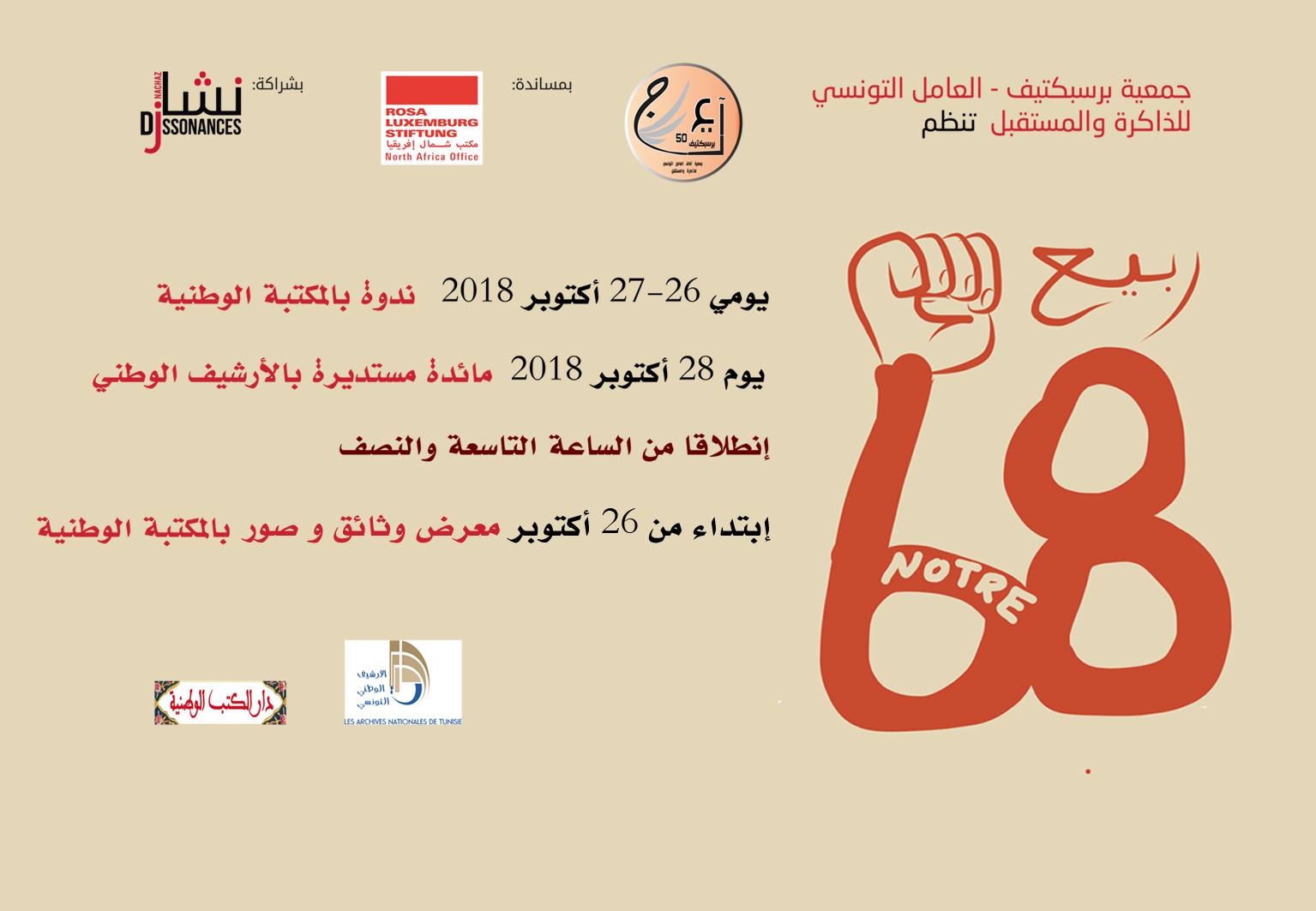 · ندوة حول ربيع 68 بدار الكتب الوطنية، شارع 9 أفريل 1938، يومي 26 و 27 أكتوبر 2018. انطلاقا من الساعة التاسعة والنصف